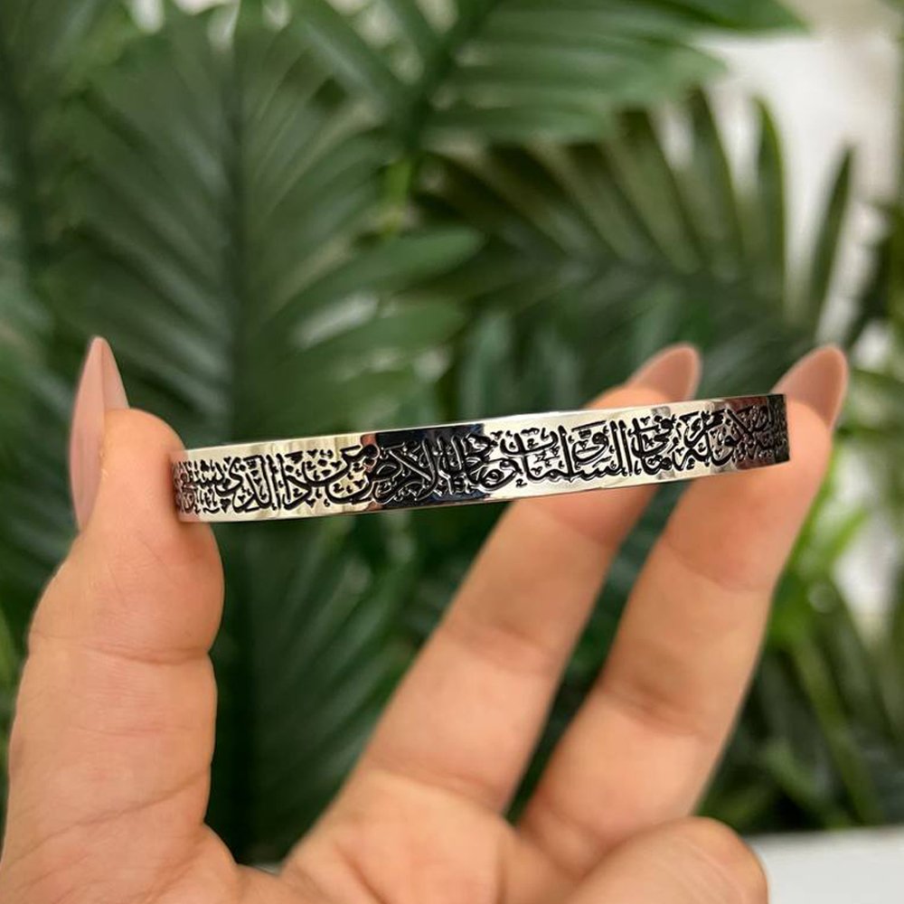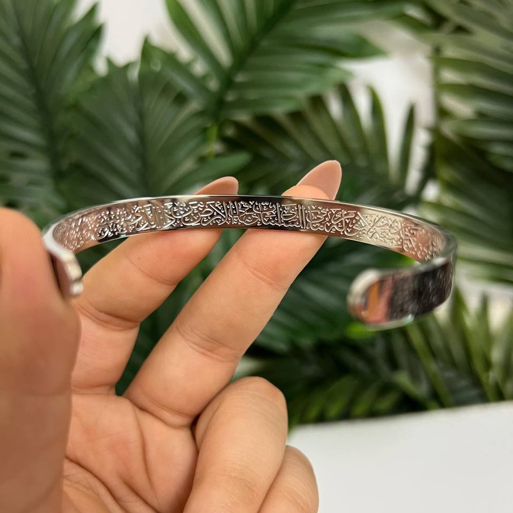 إسورة ستانلس ستيل أصلي 100%، لونها فضي ثابت مبتغيّرش، محفور عليها آية الكرسي بدقة ووضوح.